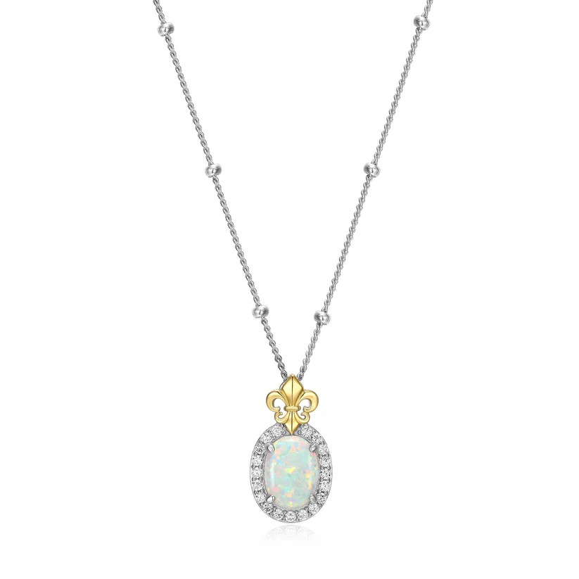 (724) 758-3248Sterling Silver L'Opal Created Oval Opal and Cubic Zirconia Fleur De Lis Necklace 17"+2" Rhodium and Yellow Gold Finish